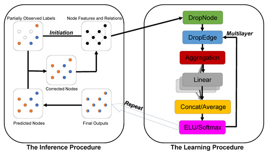 In this paper, we propose a novel approach called the graph-retraining neural network (GRNN), which conducts smoothing over the graph using a graph convolution neural network. The key idea behind the approach is similar to the expectation-maximum algorithm [17], alternating between a learning procedure and an inference procedure. It is different from GMNN [18], which contains a conditional random field [19] to model the joint distribution of the labels conditioned on representations. In the learning procedure, instead of maximizing the likelihood function, GRNN uses graph neural networks to train all node representations to minimize loss function or maximum accuracy, which can adjust the graph neural network’s weight. In the inference procedure, instead of calculating the expectations of the likelihood function, GRNN predicts all node labels using the final outputs of graph neural networks. Inspired by the idea of keeping the known representations at training nodes fixed [20,21], GRNN updates the predicted node labels by correcting the training labels in the inference procedure. To alleviate the problem that the expectation-maximum algorithm has a significant influence on the initially predicted labels, GRNN uses graph neural networks to train the training set and adjust the graph neural network’s weight as the initial weight. The architecture of GRNN alternating between a learning procedure and an inference procedure is illustrated in Figure 1.