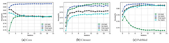 Moreover, Figure 3 evaluating the contributions of GRNN with different layers shows that GRNN with two layers achieved stability and high accuracy in the standard citation network with the increase in the number of iterations. With the increase in the number of iterations, the effect of GRNN follows the law of diminishing marginal utility. Therefore, in the absence of current GPU computing capability integration, we recommend that the number of iterations be about four (and even only two).