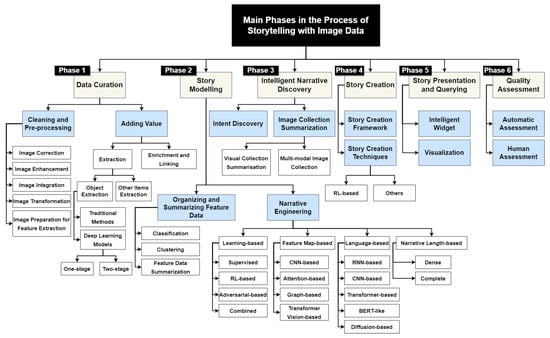 In this survey, we focus on the research problem of “understanding the image data” in general and, more particularly, analyzing the state of the art in the curation, summarization, and presentation of large amounts of image data in a succinct and consumable manner to end-users. We argue that stories are able to combine data with narratives to reduce the ambiguity of data, connect data with the context, and describe a specific interpretation. We aim to advance the scientific understanding of storytelling with image data in general, and image data curation, event/entity extraction and discovery, narrative formation (e.g., event stream processing), Knowledge Bases [], Knowledge Lakes [], and Knowledge Graphs [,] in particular. We provide a systematic review and comparative analysis of methods and tools to identify, evaluate, and interpret relevant research in the field of storytelling with image data. This paper introduces storytelling as a process that facilitates understanding image data. This process uses several phases, from cleaning and cleansing, followed by curation and adding value. Several approaches in this paper focus on preparing an image for data analytics and turning a raw image into contextualized knowledge, which is very critical for the process of storytelling with image data. Therefore, we decided to conduct a comprehensive review of the existing work in image processing, cleaning, and curation, preparing the understanding of the importance of these phases in the storytelling process. These phases and steps of storytelling with image data are highlighted in Figure 2.