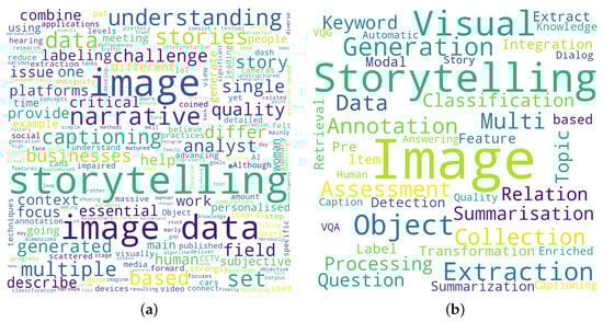 This work is a systematic literature review (SLR) on storytelling with image data based on the standard guidelines for performing SLR in software engineering []. The most crucial aspect of any SLR is identifying the research questions (RQs). Table 1 demonstrates the list of research questions (RQs), the discussion, and the main motivation that we focus on to identify state-of-the-art storytelling methods with image data, which is discussed in detail in Section 2.2. Moreover, Figure 3a shows a word cloud representation of research questions and their corresponding main motivations, with more frequent words in larger font sizes. Word clouds, in general, are visual representations of textual data. They highlight the most prominent or frequent words and ignore the most common words in the language. These figures pinpoint the most important keywords in our search keywords and question–motivation pairs for storytelling with the image data field. Finally, the detailed classification of different categories with their subcategories, references, time period, and the number of references in each subcategory is mentioned in Table 2 in this survey.