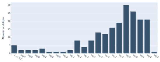 We included all possible search strings related to each part and did our best to make sure no potential study is missed in our results. Moreover, the word cloud representation for the search keywords is demonstrated in Figure 3b. In addition, we included articles published since 1980, and the yearwise distribution of the selected articles after the paper quality assessment phase is represented in Figure 4. These selected articles were included in our study if they met the inclusion criteria explained in the following.