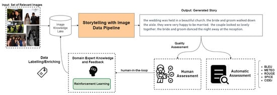 Storytelling with image data can be identified as an analytics approach to turning insights into actions. Despite the early adoption, storytelling systems are still in the early stages of development, with many unsolved theoretical and technical challenges stemming from the lack of a formal framework for story modeling and creation from data identifying the notion of story schema, story instance, story element, and narrative. Most related works [,] in storytelling presented interactive visualizations to convey data-driven discoveries in a captivating and intuitive way. However, storytelling with image data is much more than sophisticated ways of presenting data visually. Organizing image data, contextualizing it, enhancing the discovery of related events and entities in the image, and presenting it interactively to end-users are the main challenges in storytelling with image data. However, more importantly, there is a need to evaluate the quality of the constructed stories and narratives, which is still a big challenge. We further discuss the current methods for assessing the quality of generated stories in Section 8; however, we leave it as future work since there is a huge knowledge gap in this part and it is still an active research field.