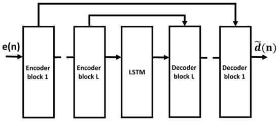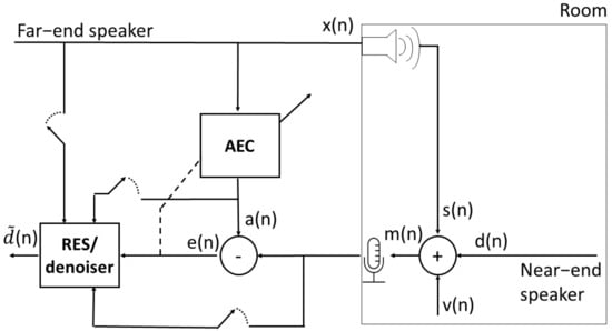 The output of a linear AEC is expected to contain a distorted weaker version of the echo signal, while keeping the near-end signal almost distortionless. Therefore, denoising the estimated near-end signal with a designated speech denoiser might suppress the residual echo, while eliminating other noises. Research on deep-learning-based speech enhancement algorithms has seen significant progress over the last few years, with many models exhibiting excellent performances [,,]. For a speech denoiser to achieve good performance as an RES, the AEC must produce residual echo that closely resembles noise, rather than human speech.