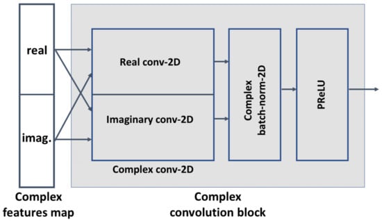 The encoder and decoder branches of the model were symmetrical, where the outputs of each encoder block were used as the inputs of the next encoder block and as additional inputs to the decoder block of the same level. These connections between the different encoder and decoder blocks are termed skip connections. Skip connections have two advantages: they provide an alternative path for the gradient during back-propagation, which is beneficial for model convergence, and they allow re-use of features from the encoder in the decoder. Each encoder/decoder block comprised a complex 2-D convolution layer, a complex batch-normalization layer, and a real parametric rectified linear unit (PReLU) activation function [], as depicted in Figure 3.