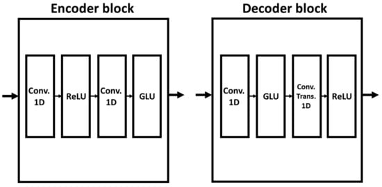 As an alternative to the RES model, an off-the-shelf, pre-trained speech-denoising deep-learning model [], which accepts a single input and outputs , was utilized. A speech-denoising model might be considered an alternative to an RES in cases where the residual echo resembles noise more closely than speech. In these cases, the residual echo might be suppressed while preserving the near-end speech. The utilized speech-denoising model was based on the DEMUCS architecture []. The model operated in the time domain, and similarly to DCCRN, it employed a convolutional encoder–decoder structure and an LSTM between the encoder and the decoder. A single encoder block consisted of two 1-D convolution layers. The activation function of the first convolution layer was the rectified linear unit (ReLU) [] and the activation function of the second convolution layer was the gated linear unit (GLU) []. The output of the encoder block was passed to the next encoder block (or to the LSTM when it was the final encoder block) and to its matching decoder block via a skip connection. A decoder block received both the output of the matching encoder block and the output of the previous decoder block (or the output of the LSTM when it was the first decoder block). The inputs were summed element-wise. The structure of the decoder block mirrored that of the encoder block, except after the first convolution layer, a 1-D transpose convolution layer was employed to upsample the signal. The structure of the encoder and decoder blocks is depicted in Figure 4. The general structure of the speech-denoising model is depicted in Figure 5. Further details regarding the model’s architecture can be found in [].