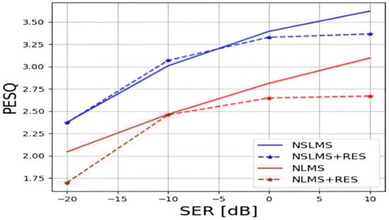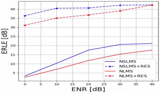 Finally, the performances of the NSLMS and NLMS as linear AECs, as well as combined with the proposed RES model, were compared for different SERs and ENRs. Figure 6 shows the PESQ scores for different values of SER in the double-talk scenario. NSLMS achieved superior PESQ over NLMS in all SERs, both as a standalone linear AEC and combined with the RES model. Furthermore, in all SERs, the RES model did not improve PESQ when employing the NLMS linear AEC. On the other hand, in the more challenging scenarios of lower SERs, the RES model improved in PESQ when employing the NSLMS linear AEC. Figure 7 shows the ERLE for different values of ENR during far-end single-talk periods. Again, NSLMS achieved superior performance over NLMS in all ENRs, both as a standalone linear AEC and combined with the RES model. In the challenging low ENR scenarios, the performance gap between the NLMS + RES and NSLMS + RES systems was greater than the respective gap in higher ENRs, further showing the advantage of using NSLMS over using NLMS in challenging scenarios. Overall, the graphs show the superiority of NSLMS over NLMS, both as standalone linear AECs and combined with the proposed RES model, in various conditions and settings. Furthermore, the graphs show that the advantage of using NSLMS over NLMS was even more significant in challenging scenarios and conditions.