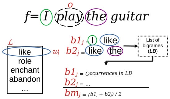 We then formed two bigrams, and , for each . Bigram is formed by the word adjacent to the left of o in f concatenated with the word , and is formed by concatenating with the word adjacent to the right of o in f. To illustrate the formation of these bigrams, we show, in Figure 2, an example where f is the sentence in English “I play the guitar” and the word will be substituted. Next, we calculated the mean value, , of the frequencies with which and occur in . If o is the last word in f, corresponds to the frequency of . The value of each is then combined with , the cosine similarity obtained with Equations (1) and (3), and the list is reordered in descending order according to the new values: