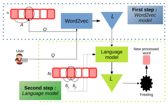 Vector is thus produced by reducing the features of ( is further away from ) and enhancing the features of and . Next, we provided as the input to Word2vec and kept the first outputs in a list ; in other words, list is formed by the M embeddings output from Word2vec that are closest to . The list then has M entries, where each entry, , corresponds to the embedding of a word, , associated with . The value of M was chosen so that the execution time was not excessive, while still maintaining the good quality of the results of the experiments that we conducted. We next calculated the cosine similarity, , between each and , according to Equation (1), so that