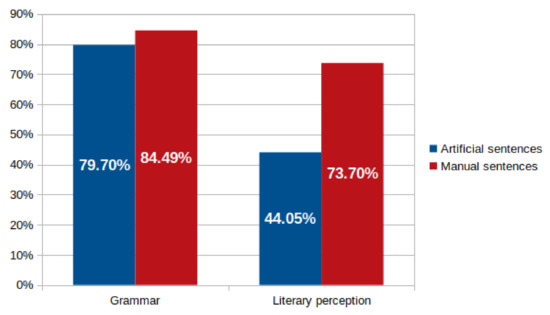 The results that we received from the evaluators were encouraging. Approximately of the artificial sentences were found to be grammatically correct, which is similar to the case of the sentences written by humans where were classified as correct. The standard deviation calculated for the classification of the artificial sentences was and indicated an acceptable level of agreement between evaluators. For the evaluation of literary perception, of the artificial sentences were perceived as literary against of the human sentences, and although the score obtained by the artificial sentences may seem low, it was still encouraging, when we consider the ambiguity inherent to literary perception among people (see Figure 4). However, this result indicated that there is still room for improvement regarding the literariness of the sentences generated by our ATG procedures.