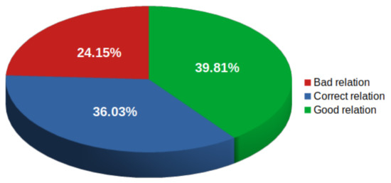 In Figure 5, we display the results obtained for the criterion that regards the semantic relationship of the artificial sentences with the contexts given by the user (the queries). It can be seen that the raters considered that of the artificial sentences had a bad relation with the given context. On the other hand, the raters considered that of the sentences had a good relation to the context, and almost of the sentences were considered to have a very good relation to the expected context.