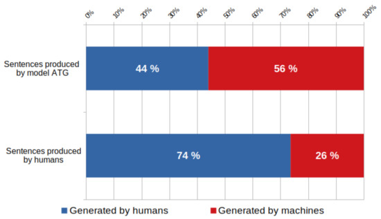 Results of the Turing test applied to the sentences produced by the ATG model. Red is used for the sentences perceived as artificial and blue for the sentences perceived as written by humans).