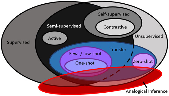 Within ML, one can largely divide the field through families of methods, such as “symbolist,” “connectionist,” “Bayesian,” “evolutionaries,” and “analogizers,” as summarized in Table 1 [11,12]. Notably, while “analogizers” semantically appear to be related to “analogical inference,” this is only tangential, as the methods in this space refer to spatial similarity of classes based on distances between groupings in a data space [11]. Alternatively, ML algorithms can also be described in terms of different paradigms as it pertains to training, such as “supervised,” “unsupervised,” or “semi-supervised” [13]. Thus, to understand how these are related but differ from the topics of interest—transfer learning and analogical inference—there is a need to formally establish the major differences between common types of machine learning, as shown in Figure 1.