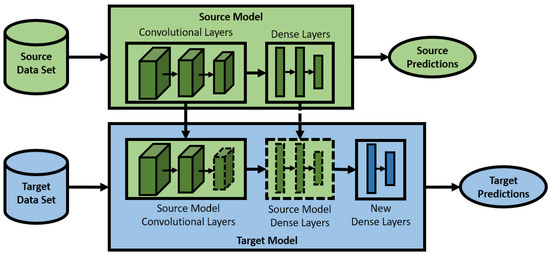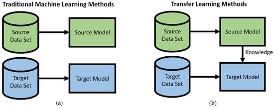 Transfer learning became an active research area in the early 1990s, though the technique and its applications date back to the mid-1970s [28]. Transfer learning differs from other traditional machine learning methods because of its focus on the interaction and “transfer” of knowledge from a source model to a target model. As shown in Figure 2a, a traditional approach would treat the source and target datasets completely separately and train a separate model for each. In contrast, a transfer learning approach (shown in Figure 2b) would create a model from the source dataset and utilize that knowledge to train a model for the target dataset.