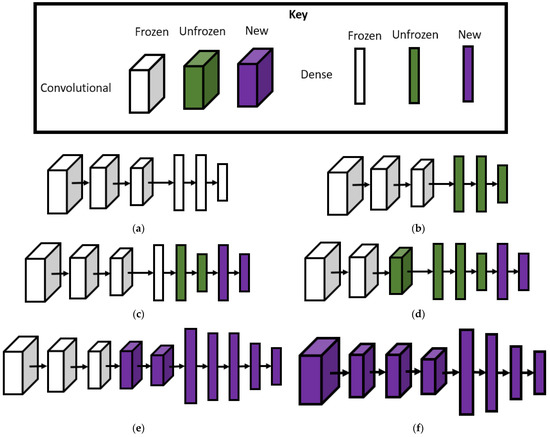 Varying amounts of “knowledge” transferred in a transfer learning application involving ANNs: (a) original source mode; (b) frozen convolutional layers with unfrozen dense layers; (c) frozen convolutional layers with a combination of frozen, unfrozen, and new dense layers; (d) combination of frozen and unfrozen convolutional layers and a mix of unfrozen and new dense layers; (e) combination of frozen and new convolutional layers with all new dense layers; (f) all new convolutional and dense layers, i.e., a completely separate model.