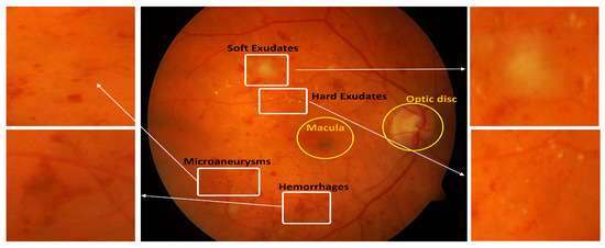 Diabetes can lead to two serious eye conditions: diabetic retinopathy (DR) and diabetic macular edema (DME). DR is assessed by grading the presence and severity of retinopathy in the macula and peripheral retina of each eye [3]. DR is divided into non-proliferative diabetic retinopathy (NPDR) and proliferative diabetic retinopathy (PDR) and is graded based on the presence of microaneurysms, hemorrhages, cotton wool spots, and hard exudates, as illustrated in Figure 1 [4]. Meanwhile, DME is identified by the presence of blot hemorrhages and hard exudates within a 2-disc diameter from the center of the macula.