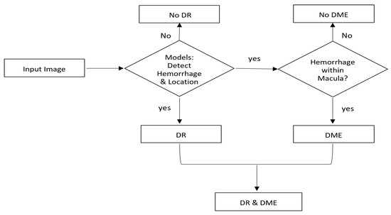 Figure 3 provides a visual representation of the process of using the models to detect hemorrhages within an input image and determine the presence of either DME or DR. The input image is fed into the base deep learning models trained to detect hemorrhages and locate them within the image. The models output a prediction on the presence of hemorrhages within the image. If a hemorrhage is detected, the location of the hemorrhage with respect to the macula is calculated. The location of the hemorrhage is then used to classify the images. If the hemorrhage is found within the macula, it is determined that DME is present. Otherwise, DR is present.