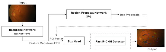The Region Proposal Network (RPN) [28] is a deep learning network used for object detection that generates rectangular object proposals with corresponding objectness scores from the input image. It shares its convolutional layers with the Fast R-CNN object identification network to save computation time. The Box Head is a type of region of interest head that uses fully connected layers to refine box placements and classify objects. It takes the feature maps and region proposals generated by the RPN and performs computations on each region, cutting and warping the feature maps with proposal boxes to create multiple fixed-size features. The final output is limited to 100 boxes after non-maximum suppression.