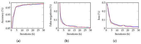 Figure 6. Faster R-CNN (R50-FPN) in red and Mask R-CNN (R50-FPN) in blue over 30k iterations. (a) Illustrates accuracy, with Mask R-CNN (R50-FPN) having a higher overall accuracy of 99.34%. (b) Compares false negative rate, with Mask R-CNN (R50-FPN) performing better with a final false negative rate of 0.8%. (c) Demonstrates convergence of loss value, with Faster R-CNN (R50-FPN) demonstrating faster convergence and a lower minimum loss value.