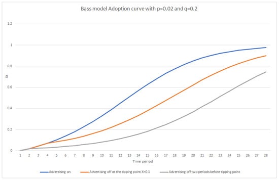 Understanding this equation is important in developing a cognitive model for technology adoption as it provides a theoretical framework for understanding the diffusion of new products and technologies in a population. This simple differential equation describes the dynamics of adoption and the roles of innovators and imitators in the process. By using the model, researchers can better predict how quickly a technology or product will be adopted and by whom. This information can be used to develop targeted marketing strategies, estimate future sales, and identify potential roadblocks to adoption. In this equation, p is the coefficient of external influence, and q is the coefficient of internal influence and exerts an effect proportional to the number of earlier adopters. The impact of advertising on the Bass model adoption curves is shown in Figure 1 for p = 0.02 and q= 0.2. As shown in this figure, stopping the advertisement of new products and technologies would result in delayed and slower adoption by the target societies.