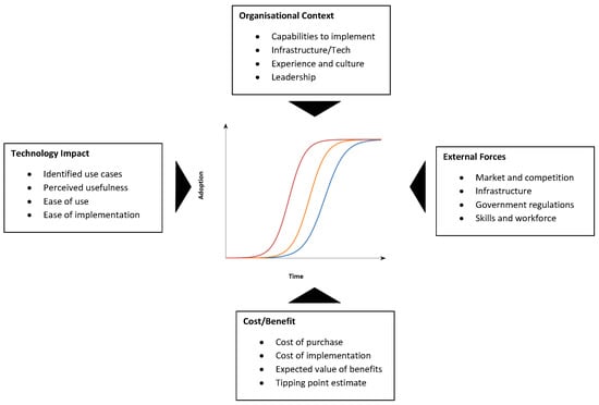 At the organizational level, the “Technology, Organisation and Environment” (TOE) framework developed by DiPietro et al. in 1990 [15] has identified the three following constructs that influence the adoption of technology by an organization: (i) The internal and external technological context, such as availability, best practices, and equipment; (ii) The organizational context such as firm size, slack, communication processes, and managerial structure; and (iii) The environmental context of industry characteristics, market characteristics, technology support structures, and government regulations. Oliveira and Martins [9] showed that IDT constructs are identical to the technology and organization context of the TOE framework, but as TOE includes additional constructs, the TOE framework is found superior to IDT to explain technology adoption. Finally, Electronic Data Interchange (EDI) [16] adoption model, which was developed in a multiple case-study research program by Lacovo et al. in 1995, explains that ‘perceived benefits’, ‘organizational readiness: available financial and technological resources’, and ‘external pressure’ (competition) predict the speed of technology adoption by firms.