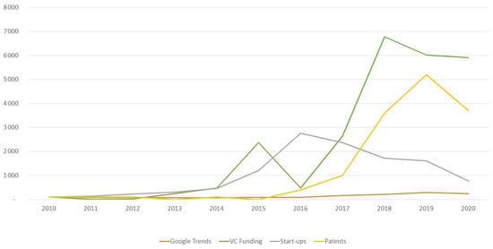The trends of RPA technology’s attributes, including Google trend, VC Funding, Start-ups, and Patents trends in the past decade.