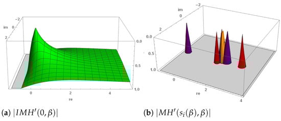 This allows us to conclude that the simple root of () is superattracting if , attracting if , but also that it is not a fixed point of if . Regarding the rest of strange fixed points, , , they can be attracting or even superattracting in some small areas of the complex plane, where their stability functions satisfy for any . □