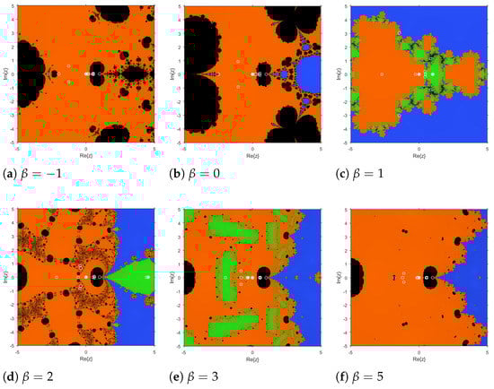 We plot the dynamical planes related to rational function , for . These planes can be visualized in Figure 2. In Figure 2a, orange area is the basin of attraction of (multiple root) and black points correspond to the attracting area of the parabolic fixed point and the basin of a periodic orbit of period 2; in cases of and (Figure 2b and f, respectively), the basin of attraction of the simple root () appears in blue, and in black the attracting area of the parabolic fixed point ; in Figure 2c–e, the basin of attraction of an strange fixed point appears in green color.