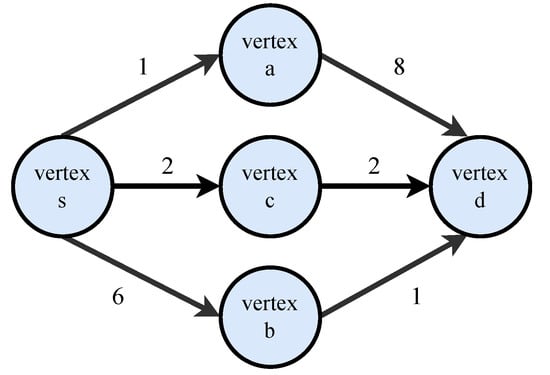 The DSP problem is a generalization of the Shortest Path (SP) problem, having applications in many areas like transportation networks, data flow analysis, database systems, and network routing [4,5,6]. Hence, to enhance comprehension, we begin with a formalization of the SP problem before introducing the DSP one. The SP problem can be represented by a graph , where V is a set of vertices and E is a set of edges composed of the traversing cost. A path corresponds to a sequence of vertices connected by edges. In an SP problem, the goal is to find a path between a source vertex and a destination vertex , whose cost (of the comprising edges) is minimum. Traditionally, finding the shortest path corresponds to finding the path with the shortest distance. However, to make this concept broader, here we refer to finding the route with the minimum cost (or optimal route), which better accommodates other cost definitions, such as distance, time, energy consumption, and comfort. Figure 1 shows an example of an SP graph where the shortest path regarding the edge costs is through the vertices .