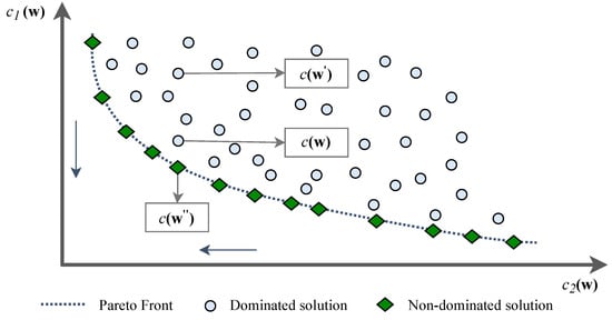 Evolutionary algorithms or Multi-Objective Evolutionary Algorithms (MOEAs) define a set of candidate solutions in each new iteration using a Pareto-based classification scheme. At the end of each iteration, those algorithms find a set of candidate solutions to compose the Pareto front. A strong point of using MOEAs to find the Pareto front is the capability of finding multiple Pareto-optimal solutions in just one simulation. However, MOEAs need attention on the algorithm choice and its parameterization since, quite often, the tuning of the parameters is necessary to reach the best results with reliability, robustness, and accuracy [36]. In addition to parameterization, there is also the issue of avoiding the local optimal solutions using fitness functions. Some of the most-important algorithms here include Non-dominated Sorting Genetic Algorithm II (NSGA-II) [37], Strength Pareto Evolutionary Algorithm 2 (SPEA-2) [38], the Multi-Objective Ant Colony System (MOACS) [39], and Multi-Objective Particle Swarm Optimization (MOPSO) [40].