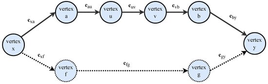 We can observe two moments for choosing a path in Figure 3. In the first moment, assume that vertices f and g do not exist in the graph. In this case, the possible path is through vertices . Choosing this unique available path results in a cost denoted by , which can be expressed as . In the second moment, assuming new vertices f and g are inserted in the graph, it is necessary to consider the newly available path through the new vertices verifying if the solution is non-dominated. In this case, the new path has a cost denoted by or .