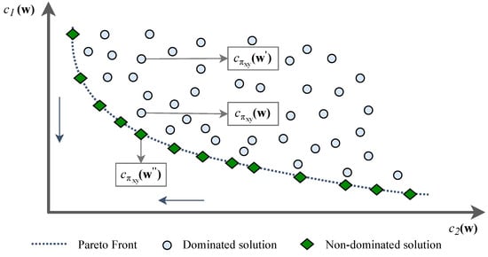 - Known weights: In this scenario, the decision-making process already has its preferences in the form of weights that indicate the relative importance of each objective. This type of problem offers relatively small computational complexity, as it allows the direct search for the optimal Pareto solution. The scenario of known weights is usually handled with a priori methods, where a scalarization of the objectives can be determined before running the algorithm [30,31].