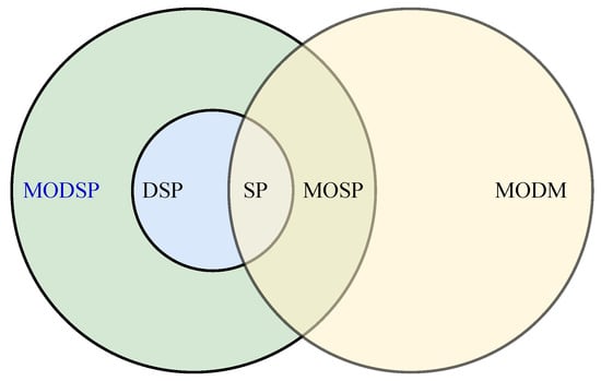 Venn diagram representing the taxonomy of the MODSP problem class and its relationship with the DSP, MOSP, SP, and MODM problem classes.