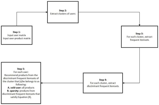 It is important to note that the proposed methodology can straightforwardly be applied also to predict the products that the user does not like. This can be achieved simply by extracting frequent itemsets and hence discriminant itemsets based on cells with cell values equal to 0. In this case, a discriminant itemset consists of products that cannot be recommended to each user of a cluster, based also on Equation (4). Then, the proposed methodology can update the initial user–product input matrix by adding zero to certain cells whether they were initially empty or not.