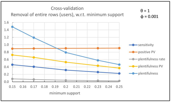 The results in Figure 2 show that the value of plentifulness is greater than 1, which means that the proposed methodology recommends more products than those included in the initial user–product input matrix. This is a very important result as far as the sparsity problem is concerned. Note that the density of the initial user–product matrix is 6.3%. which is increased to about 14% by the proposed methodology (plentifulness rate ≈ 8%), while only a small fraction of initially non-empty cells turned into empty cells by the proposed methodology (plentifulness predictive value ≈ 0.73). At the same time, the results in Figure 2 show that the value of positive predictive value is close to 1, which means that the proposed methodology does not recommend products that were negatively rated by the user (FP), although some of the products that were initially positively rated by the user are not recommended (sensitivity ≈ 0.5).