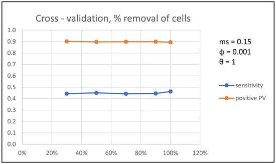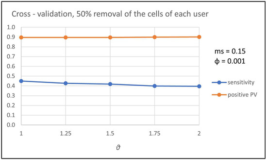 Note that there is a difference in calculating the measure of sensitivity within this paper compared to other similar problems (e.g., in disease diagnosis), because of the existence of empty cells (null cell value). Since the proposed methodology, apart from adding positives (predicted cell value = 1), is allowed to leave empty cells within the test subset, the sensitivity measure could be low. This is because some positives in the initial input matrix (existing cell value = 1) can be left empty, which, although they are not false positives, cannot be considered true positives, as well.