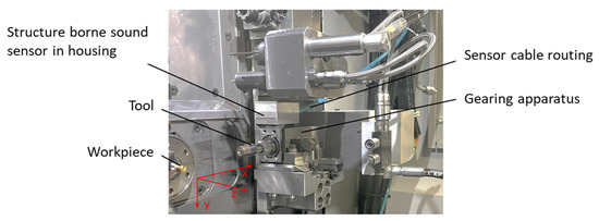 The application of the structure-borne sound sensor greatly affects its signal quality. The location must be chosen so that a direct sound transfer is allowed, with the sound passing through as few interfaces or sound-generating components, such as bearings and gears, as possible. Wang and Liu [23] and Carrino et al. [27] proposed attaching the structure-borne sound sensor to the workpiece, while Inasaki [24] preferred attaching it to the tool with the advantage of a constant distance between the sensor and the cutting point. Variable distances could lead to dynamic damping and distort the signal.