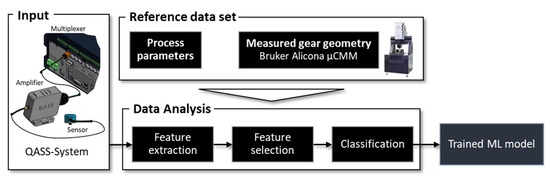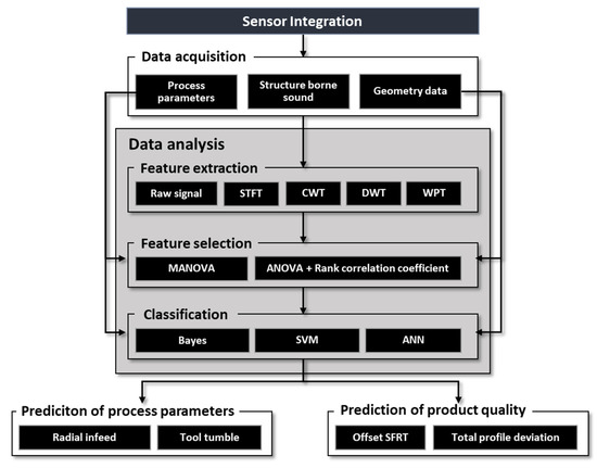 In previous work, various sensor integration layouts were compared using a cost–benefit analysis in terms of signal quality, sensor accessibility, and sensor protection from chips and oil. The selected layout is described in Section 3.2. In the “Data Acquisition” step, structure-borne sound signals of the hobbing process are subsequently recorded using the design of experiments, which will serve as the data basis. To investigate the relationship between the structure-borne sound signals and the process parameters or the quality of the manufactured gears, the process parameters of tool tumble and radial feed are varied in a full factorial experimental design. The geometry of all manufactured microgears is then optically measured and evaluated according to standard DIN ISO 21771. The data-analysis approach follows the procedure presented by Mikut [32] for designing a data-mining method as shown in Figure 6. Initially, features are extracted from the structure-borne sound signals. These are calculated both from the time signal itself and from various spectral analyses such as short-time Fourier transform (STFT), continuous wavelet transform (CWT), discrete wavelet transform (DWT), and wavelet packet transform (WPT). In the feature selection, two different approaches are applied. Features are selected using both multivariate analysis of variance (MANOVA) and a combined method of analysis of variance (ANOVA) and rank correlation coefficient for redundancy reduction. As input variables, the features extracted from the raw signal and the features of one spectral transformation are used together to evaluate the suitability for classification. The restriction to use only features of one spectral transformation in addition to features of the raw signal is for efficiency reasons. Both the prediction of process parameters as well as quality variables are investigated using three different classification methods: a Bayes classifier, a support-vector machine, and a k-nearest-neighbor classifier. These are evaluated and compared based on their prediction accuracy.