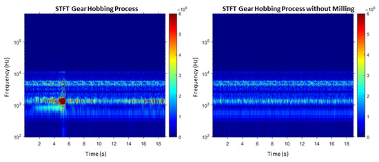 In the spectra generated by means of the STFT in Figure 9, it can be seen that the spectra with and without hobbing intervention differ significantly in the frequency range of 400–2000 Hz. These differences are caused by the material removal during the gear manufacturing process. The frequency spectrum shows a high amplitude of the frequency 487.5 Hz. This corresponds to the tooth engagement frequency of the milling tool. The engagement of the teeth of the tool results in an energy input, which leads to increased amplitudes of the structure-borne sound signal. It is thus shown that the sensor integration used enables the measurement of the structure-borne sound generated during hobbing.