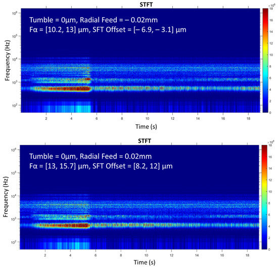 Figure 10 shows the STFT spectra of different settings of the radial feed process parameter at a tumble of 0 µm. In order to determine whether visual differences between the spectra of the different process parameters can be detected, extreme values are considered. For completeness, the classes of the total profile deviation Fα and the OTE are also given.