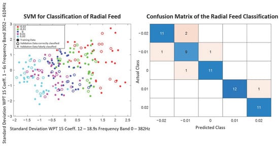 For the classification of the radial feed, the SVM is best suited with the highest accuracy of 0.9, which works with five features of the raw signal determined by MANOVA and the WPT with 15 coefficients. The learning data set and the predicted output variables of the best two of these five features can be seen in Figure 11, as well as the confusion matrix of the SVM on the right. The plot of the best two of the five features used only gives an impression of the separability of the different classes, but not of the class boundaries in the five-dimensional space. The confusion matrix is a method to assess the quality of a classification model in machine learning. It visualize the number of predictions that were correct or incorrect. The numbers entered in the main diagonal correspond to the number of correctly classified test data. The color scale (from blue to red) represents the proportion of correctly and incorrectly classified data.