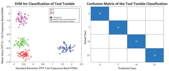 All feature combinations selected with ANOVA and the rank correlation coefficient can separate the validation data into the four tumble classes without error with an SVM. The feature combination of raw signal and STFT, as well as raw signal and CWT, can even make error-free predictions with all three classification methods examined. For the two best evaluated of the 60 selected features from the raw signal and the STFT, the training and predicted validation data of the SVM and its confusion matrix are given in Figure 12. The features selected by MANOVA from the raw signal and STFT cause the most classification errors with all trained models. The worst prediction is made by the SVM, which achieves an accuracy of 0.53.