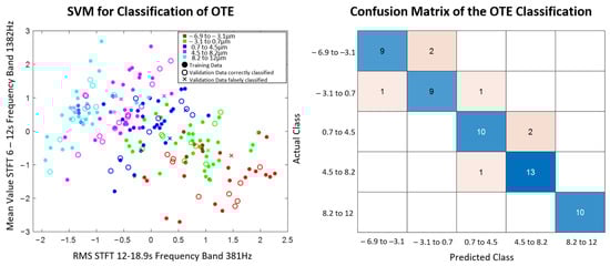 The SVM achieves the highest accuracy of 0.88 using the MANOVA selected features from the raw signal and the STFT. The highest-scoring two-way combination of the four selected features and the confusion matrix of the model are shown in Figure 13. When the trained model misclassifies data points, they are in adjacent classes to the true class. The KNN method, which uses a combination of features extracted from the raw signal, and the WPT, with 15 coefficients using ANOVA and the rank correlation coefficient, is the worst at predicting the OTE. It has an accuracy of 0.36 and assigns misclassified data points to distant classes.
