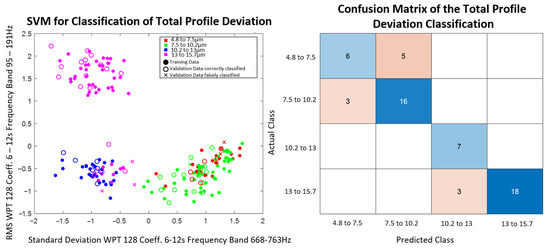 Both the SVM with features selected by ANOVA and the rank correlation coefficient from the raw signal and the WPT with 128 coefficients, and the Bayes classifier with features selected by MANOVA from the raw signal and the STFT, achieve the highest accuracy of 0.81. The SVM, with features selected by ANOVA and the rank correlation coefficient from the raw signal and the WPT with 128 coefficients, achieves the highest accuracy of 0.81. For the two best performing of the 60 features selected from the raw signal and the WPT, the training and validation data and the SVM confusion matrix are shown in Figure 14. The SVM that selects features from the raw signal and the DWT using ANOVA and the rank correlation coefficient is the worst suited for the classification of the profile total deviation. It misclassifies 84% of the data points with an accuracy of 0.16.