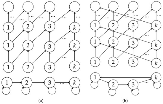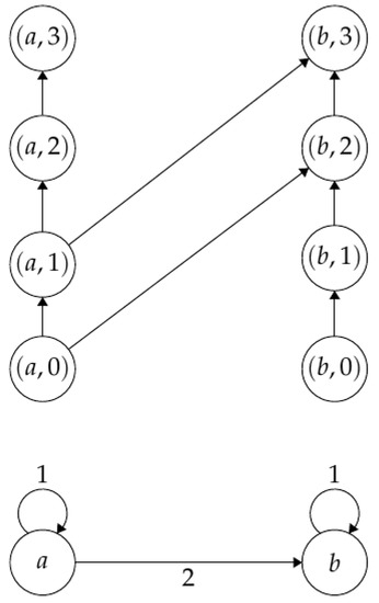 Consider the set of nonnegative integers . For a directed graph A, we denote the set of vertices and edges of A as and , respectively. We define a base diagram of A as the pair where B is a directed graph with vertices and, given any edge of labeled by , we define an edge in as between the vertices and of . The coordinate i in indicates the row position of the vertex (see Figure 1).