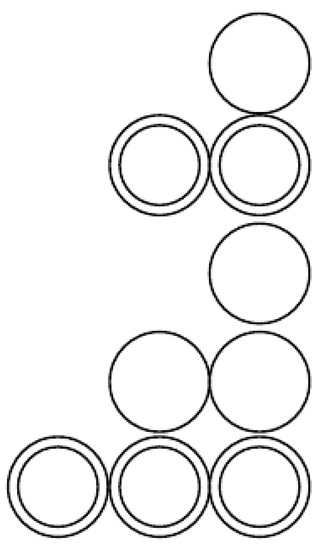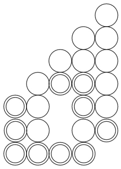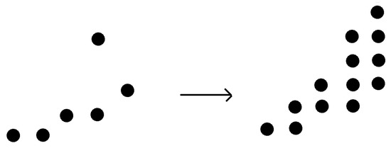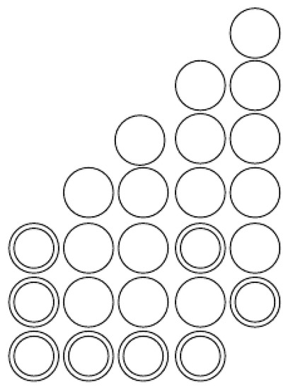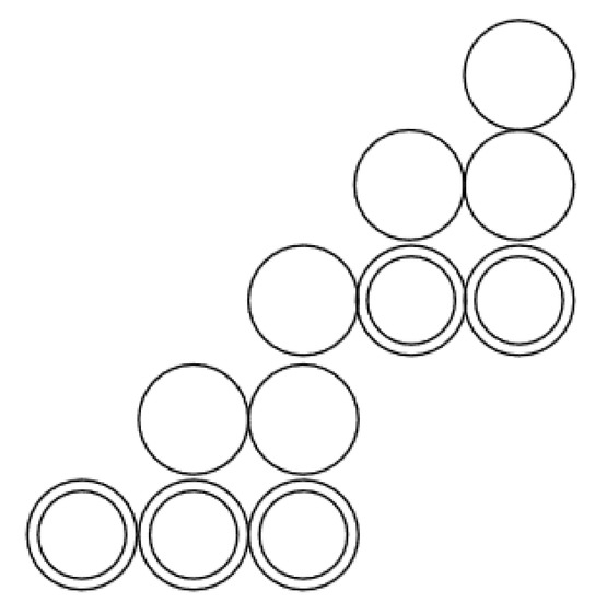 If and are activated vertices connected by a path of activated vertices with a time lower than or equal to t, then the argument in the proof of Proposition 1 shows that both of them are in a pyramid whose pyramidion has a time greater than t. As a consequence, if two pyramids and can be stacked under a given P, then pyramid cannot be adjacent to , since under Remark 2, we would instead stack the biggest pyramid, which includes both and . The activation diagram of Figure 10 is not a chinampa. Assume t is the minimum time of the primary vertices. Then, and are adjacent, and thus they are in , which implies that the middle vertex becomes a secondary vertex, which is contrary to the non-redundancy requirement.