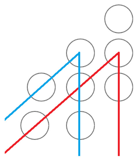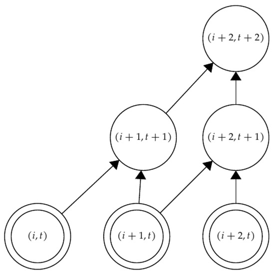 Consider and its corresponding base diagram , as described before. Fix a vertex , and consider with consecutive vertices with the same time. The set S is determined by the initial vertex of the path P, its length l, and a fixed time . We employ apyramid in the activation diagram and denote it as . In Figure 4, the activation diagram of a path with a length of three is illustrated.