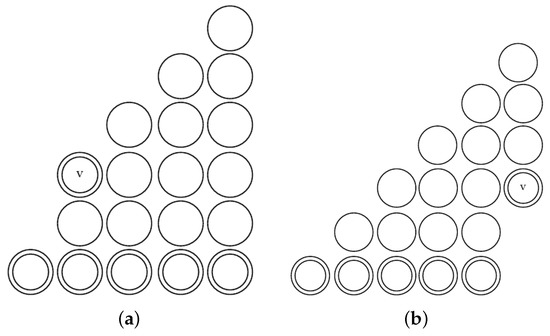 Effect of adding a primary vertex to a pyramid. (a) If we add an activated vertex v to the left side of a pyramid, then the vertices in the same diagonal with times greater than the time of v are activated until reaching the top of the pyramid. (b) If we add an activated vertex v to the right side of the pyramid, then the vertices in the same column with a time greater than the time of v are activated until reaching the top of the pyramid.