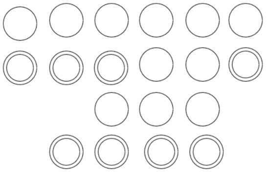 Given an activation diagram, the profit is equal to the number of secondary vertices minus the number of primary vertices. The profit measures the maximum number of extra vertices which are activated as a consequence of the topology of the graph. A connected, non-redundant activation diagram is a chinampa if its profit is greater than or equal to zero. An example of a chinampa is illustrated in Figure 8. The simplest chinampa, in the sense that it involves the least number of vertices, is , as shown in Figure 4. The name is due to the similarity of the figures with an ancestral Mexican agricultural technique that uses soil to grow crops on a lake. We imagine that chinampas have crops above the soil, and underneath, there are roots.