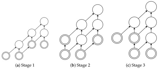 Our networks are such that there exist nodes p firing due to external stimuli and nodes s firing when the sum of the input signals from other nodes exceed their thresholds. Our goal is the study of cascades, which are networks whose number of nodes s is greater or equal to the number of nodes p. We translated the networks to a base diagram , where a node p firing due to external stimuli at time t in the network corresponded to a primary vertex of , and a node s firing as a consequence of the signals of other nodes corresponded to a secondary vertex in . In this way, a cascade in a network corresponded to an activation diagram. The activation diagram in Figure 3 is associated to a cascade.