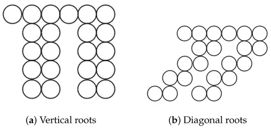 Consider the two extreme cases for , whose roots are depicted in Figure 17. In Figure 17a, the roots are formed by stacking vertically, while in Figure 17b, the instances are stacked along diagonals.